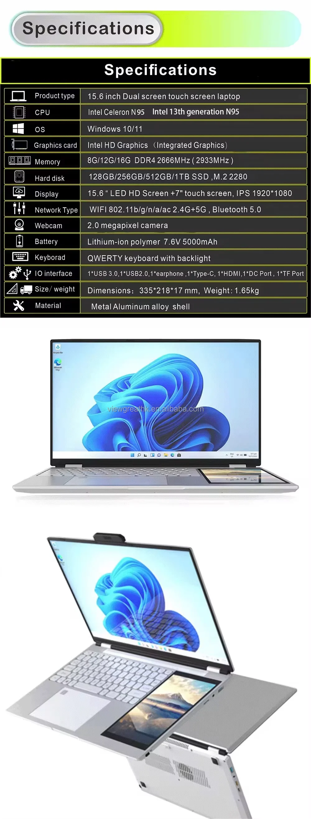 15.6 inch +7 inch touch screen dual-screen INTEL N100 512GB 1TB SSD laptop business office design