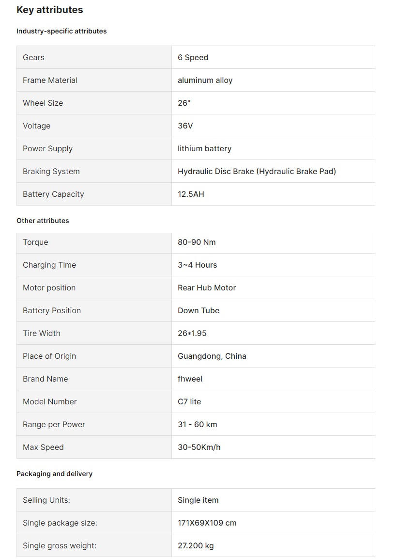 DYV E bike Fhweel C7 lite 26″ 36V 14Ah City Bicycle Aluminum Alloy Frame with Step-Thru Hidden Lithium Battery Cheap Electric Road Bike