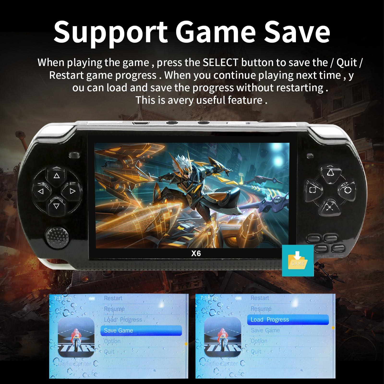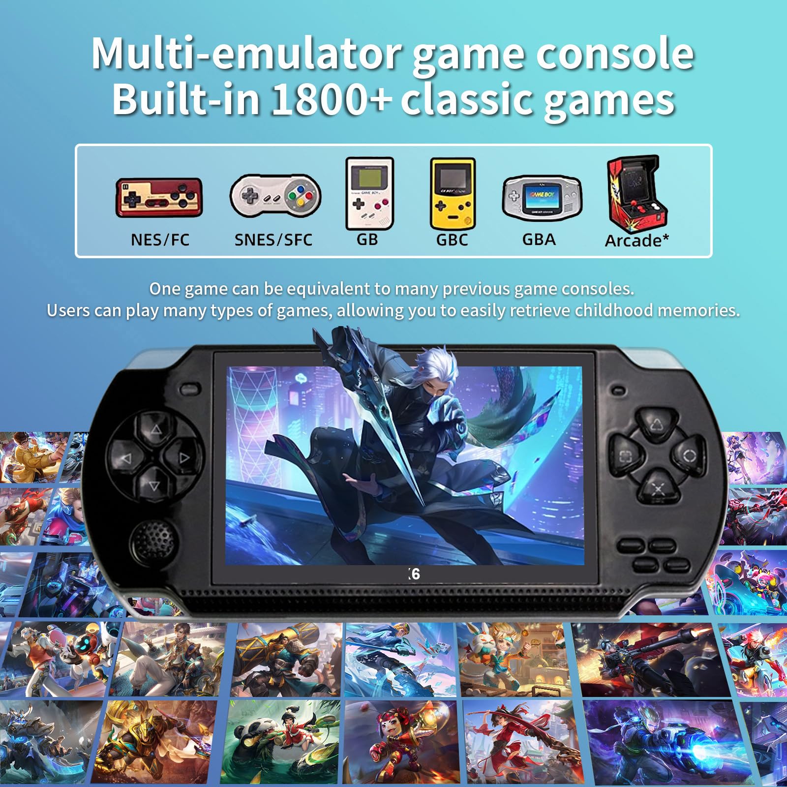 - 【Handheld Game Console】 Built in 1800+ games, 8 GB operation system. Support GBA/GBC/GB/SFC/FC/SEGA/SMC Games. How to find more games? Find the ‘Games’ icon in the lower left corner of the screen, press the ‘O’ key to enter, select ‘Ext-Games’-‘Dir List’, press the ‘O’ key to enter, you will see more games