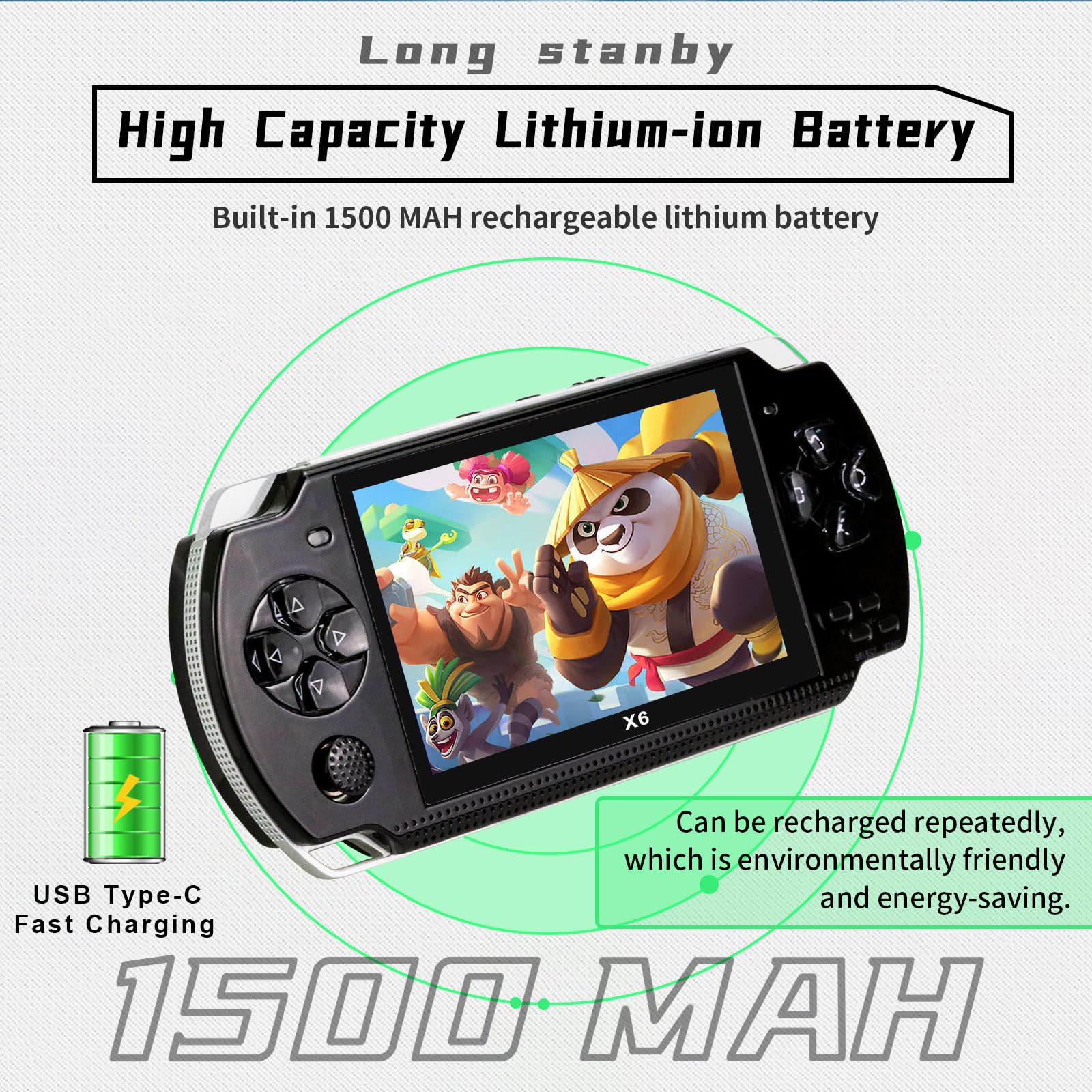 - 【Power Supply】 Built-in 1500mAh high capacity polymer lithiumbattery for ultra-long standby time and life battery, recharging by USB cable. Support long time games and music playback. release joy and energy during a trip or flying a long journey