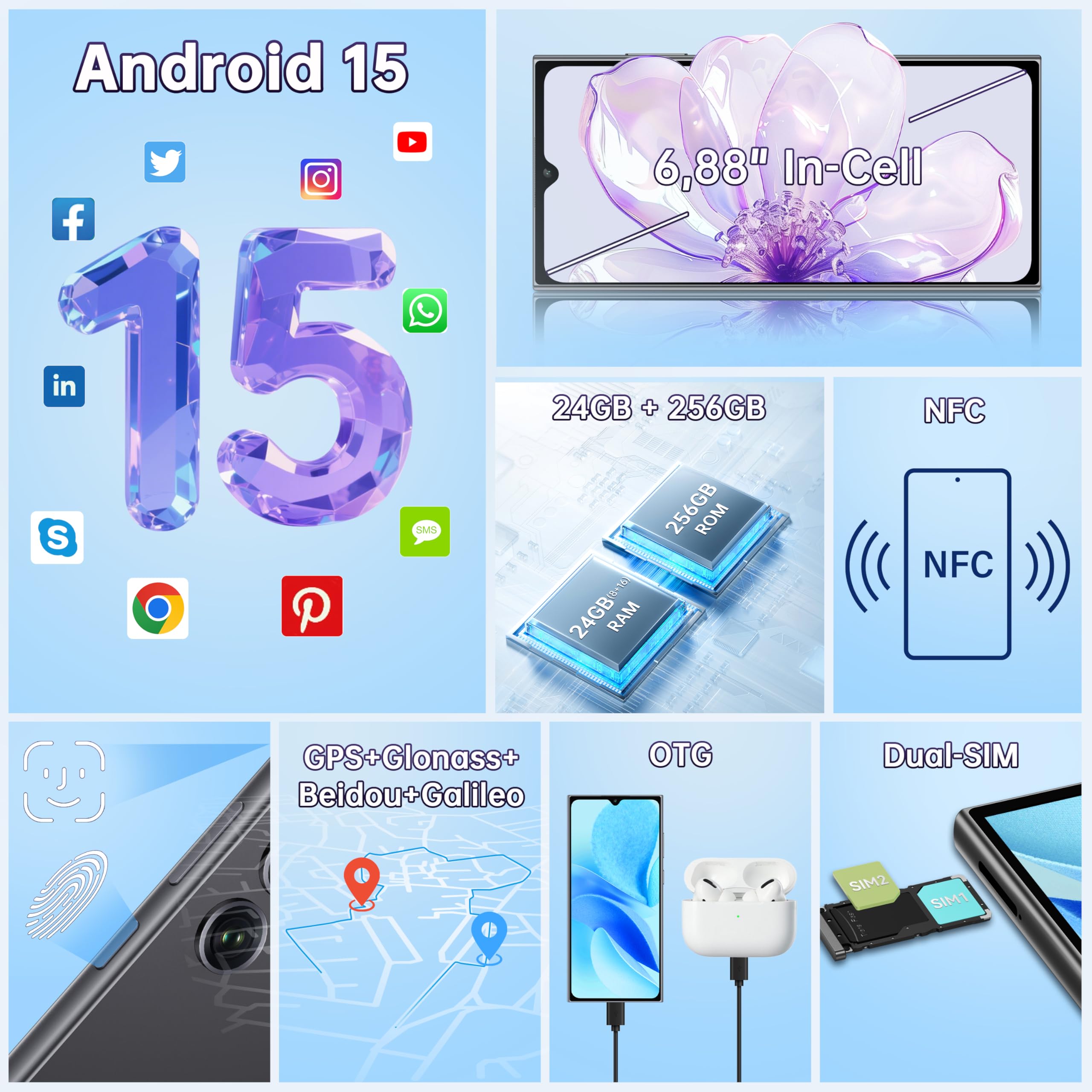- 【24GB (8gb+16gb Expansion) RAM + 256GB ROM Large Storage & Android 15 System】OUKITEL C61 Pro smart phone is equipped with 24GB large running memory (8GB physical memory + 16GB virtual expansion), with 256GB large storage space, which can easily cope with various usage scenarios such as games, HD videos, photos, office, etc. Supports up to 1TB TF card expansion. With the latest Android 15 system, the interface is smoother and the operation is more convenient. At the same time, it strengthens privacy protection and system security, making the user experience more secure.