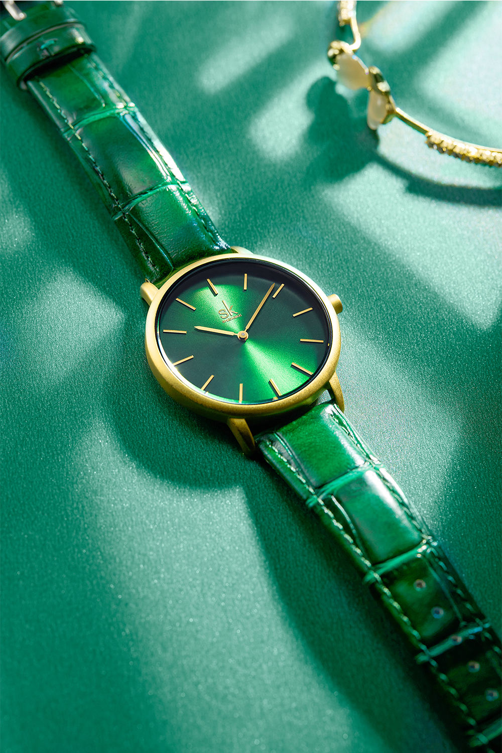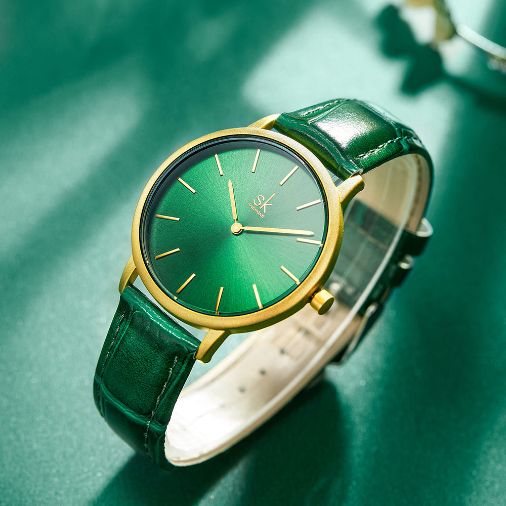 Shengke Women’s Watches Fashion Green Dial Ladies Watch Luxury Ultra Thin Female Quartz Wristwatch Green Leather Relojes K0134