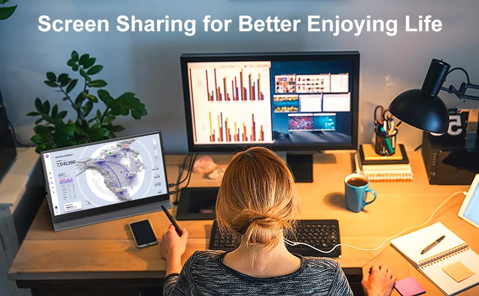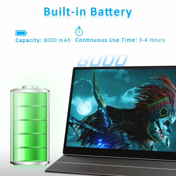 USB C portable monitor built-in 8000mAh polymer battery not only provide power supply for the monitor to work, but also can be used as power bank to reverse charge mobile phones. Once fully charged could last for up to 3-4 hours if closed the reverse charge function; or 2 hours if open the reverse charge for your phone.
