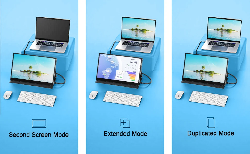 can easily connect your laptop with the included USB-C Full Function cable(one cable solution), or USB Type C cable(for power supply) and Mini-HD to HD cable (for data transmission).